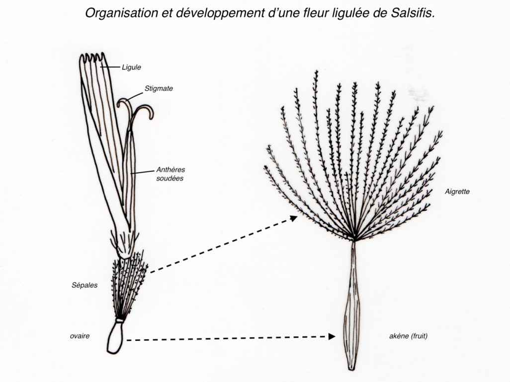 Après la pollinisation, l’ovaire se transforme en fruit (ici, akène), tandis que les sépales se développent et forment l’aigrette qui surplombe l’akène.