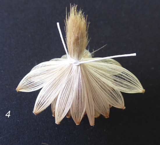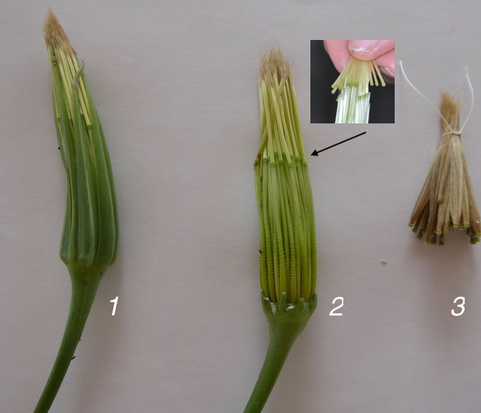 – Stade 3 : séparer tous les fruits de leur point d’attache. Lier l’extrémité des futures aigrettes avec un fil à coudre fin. Ensuite, ôter les akènes (partie basale) en pliant, au niveau de la flèche, délicatement le paquet de fruits. On obtient le paquet de la figure 3.
